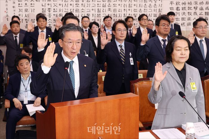 정성호 법무부 장관 등이 14일 서울 여의도 국회에서 열린 국회 법제사법위원회 법무부 등에 대한 2025 국정감사에서 증인선서를 하고 있다.