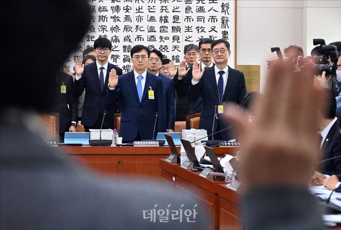 김대웅 서울고등법원장 등 기관 증인들이 20일 서울 여의도 국회에서 국회 법제사법위원회의 서울고법·수원고법·서울중앙지법 등에 대한 2025 국정감사에서 증인선서를 하고 있다.
