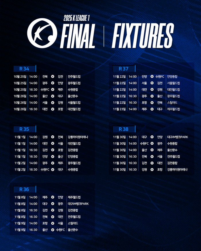 34라운드는 10월 25일(토)부터 26일(일)까지, 35라운드는 11월 1일(토)과 2일(일), 36라운드는 11월 8일(토)부터 9일(일)까지, 37라운드는 11월 22일(토)과 23일(일), 38라운드는 11월 30일(일) 열린다.