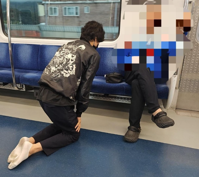 A씨가 공개한 사진에는 한 젊은 남성이 신발도 신지 않은 채 지하철 바닥에 무릎 꿇고 고개를 숙이고 있다. 좌석에 앉아 있는 승객은 이 모습을 바라보고 있다.
