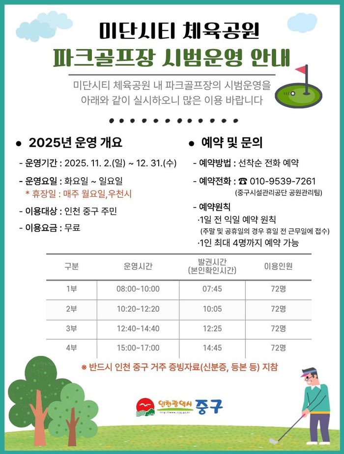 인천시 중구는 미단시티 체육공원 내에 ‘파크골프장’을 새로 조성, 다음 달 2일부터 시범 운영한다고 21일 밝혔다.