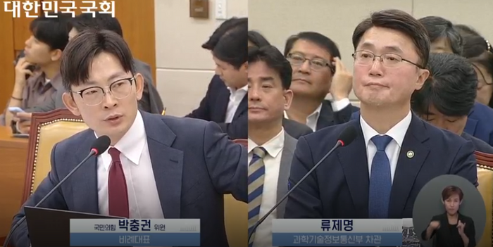 21일 오전 국회에서 열린 과학기술정보방송통신위원회 국정감사에서 박충권 국민의힘 의원이 류제명 과학기술정보통신부 2차관에게 질의하고 있다.인터넷의사중계시스템 캡
