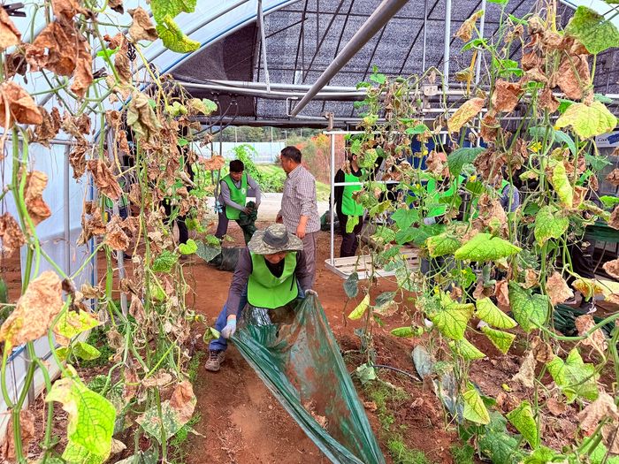박도성 IT부문 부행장을 비롯한 20여명의 임직원들이 일손 돕기에 참여해 오이 수확, 농경지 주변환경정비 등을 이어갔다.