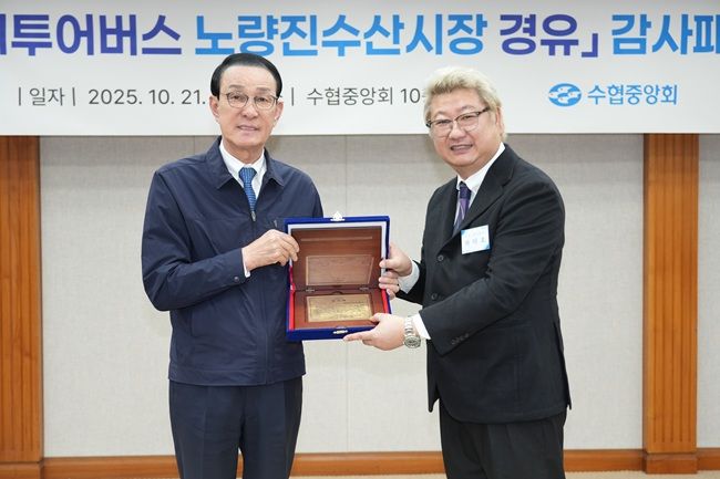 노동진 수협중앙회장이 서울시티투어버스 노선에 노량진수산시장을 유치해 낸 공로로 시장 상인회로부터 감사패를 받았다.