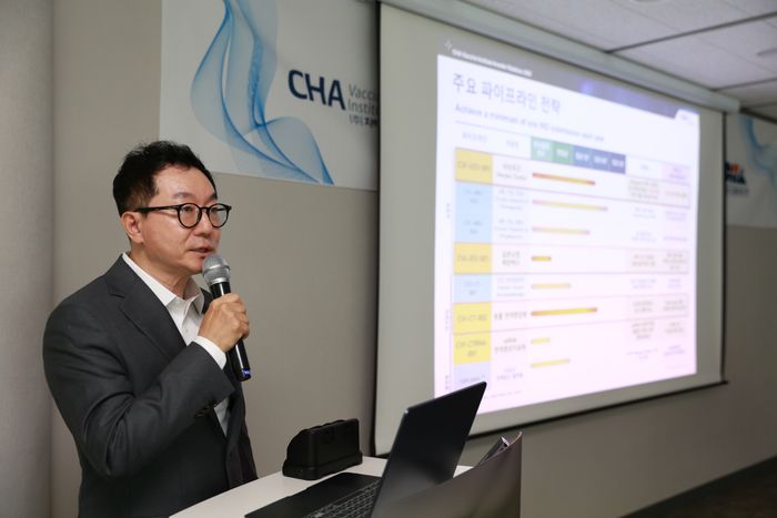 한성일 차백신연구소 대표가 22일 서울 광화문 HJ 비즈니스센터에서 열린 기자 간담회에서 기업 중장기 전략을 발표하고 있다. ⓒ차백신연구소