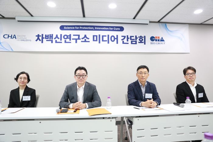 (왼쪽부터) 전은영 차백신연구소 상무, 한성일 대표, 김상기 부사장, 정시영 전무가 22일 서울 광화문 HJ 비즈니스센터에서 열린 간담회에서 기자들의 질문에 답하고 있다. ⓒ차백신연구소