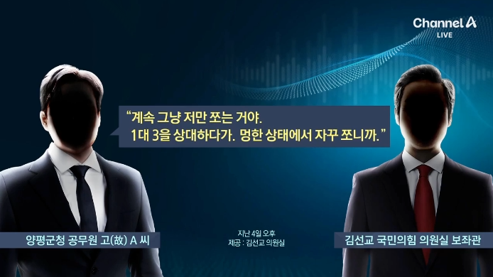 22일 채널A에 따르면 경기 양평군청 공무원 A씨는 지난 3일 새벽까지 특검 수사를 받고 난 다음날 김선교 국민의힘 의원실 보좌관에게 전화를 걸어 특검 수사의 괴로움을 토로했다.