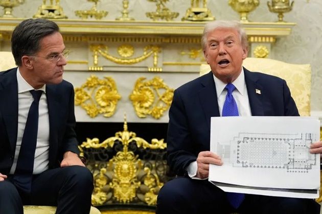 도널드 트럼프(오른쪽) 미국 대통령이 22일(현지시간) 미 워싱턴DC 백악관 집무실에서 마르크 뤼터 나토(NATO·북대서양조약기구) 사무총장과 회담 중 새로운 백악관 연회장의 좌석 배치도를 들고 있다. ⓒ AP/연합뉴스