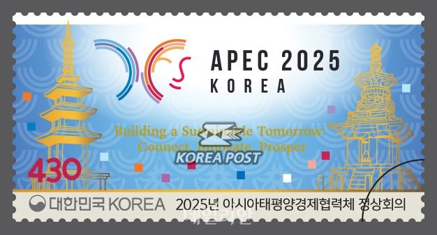 기념우표에는 한국의 대표적 문화유산인 다보탑과 석가탑을 좌우에 배치하고, 중앙에는 ‘APEC 2025 KOREA’ 엠블럼을 담았다. 천 년 넘게 서로 마주한 두 탑의 모습은 APEC 회원국 정상들이 협력과 지혜를 나누는 상징적 의미를 표현한다.