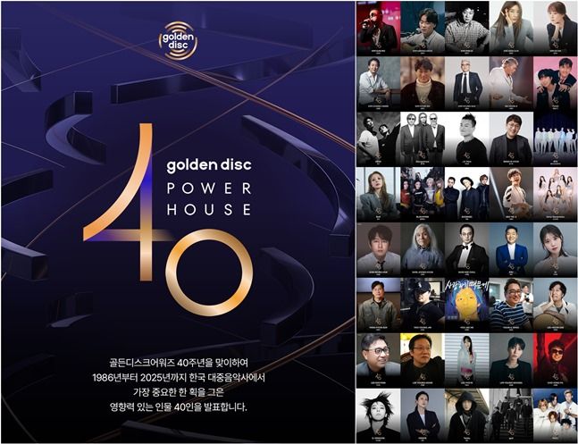 1986년 1회를 신설해 2026년 40주년을 맞이하는 ‘골든디스크어워즈’가 지난 40년간 한국 대중음악사에서 중요한 한 획을 그은 주역들을 뽑은 ‘골든디스크 파워하우스 40’ 명단을 23일 공개했다.