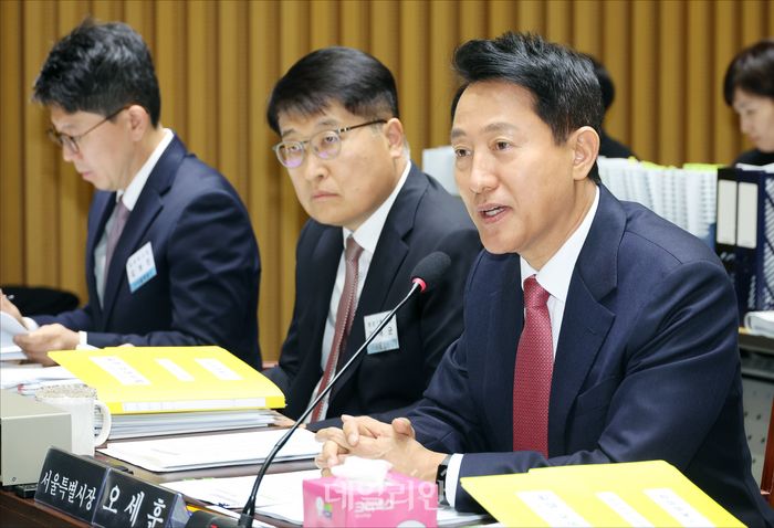 오세훈 서울시장이 23일 서울 중구 서울시청에서 열린 국회 행정안전위원회의 서울시에 대한 2025 국정감사에서 질의에 답변하고 있다.