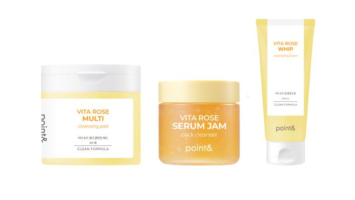포인트앤 비타 로즈 라인은 세안 단계별로 선택해 사용할 수 있도록 ▲비타 로즈 멀티 클렌징 패드 ▲비타 로즈 세럼잼 팩 클렌저 ▲비타 로즈 휩 클렌징 폼 등 3종으로 구성됐다.
