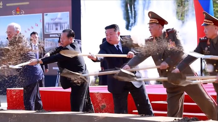 김정은 북한 국무위원장과 당·정·군 간부들이 참석한 가운데 지난 23일 평양 화성지구에서 러시아 쿠르스크주 해방 군사작전에 참전한 북한군 용사들을 기념하는 '해외군사작전 전투위훈기념관' 건설 착공식이 열렸다고 조선중앙TV가 24일 보도했다. ⓒ조선중앙TV 화면·연합뉴스
