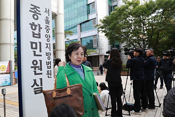 김영선 전 국민의힘 의원이 24일 서울 서초구 서울중앙지법에서 열린 김건희 여사의 자본시장법 위반 등 혐의 사건 속행 공판에 증인으로 출석하기에 앞서 기자회견을 하고 있다. ⓒ연합뉴스