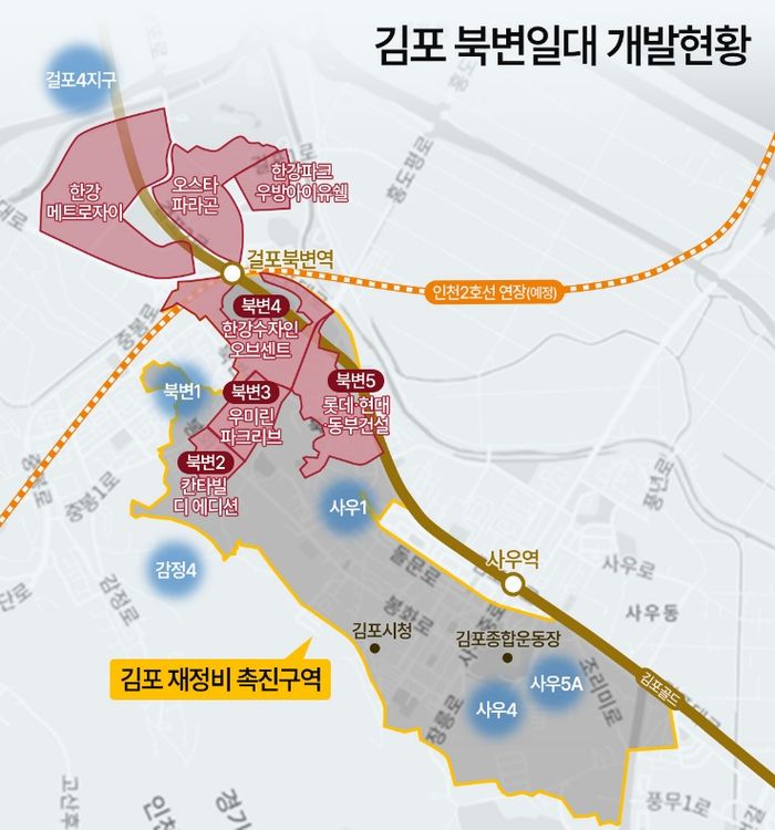 현재 김포 북변동 일대에서는 북변2·3·4·5구역이 연달아 개발 중이다. ‘김포 북변 우미린 파크리브(북변3구역, 1,200가구)’와 ‘한강 수자인 오브센트(북변4구역, 3,058가구)’는 모두 지난해 시장의 불확실성 속에서도 조기에 100% 계약을 마쳐 이슈몰이를 톡톡히 했다.
