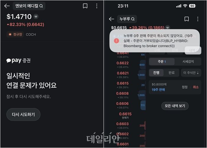 이달 7일(왼쪽)과 8일 카카오페이증권에서 전산장애가 발생해 투자자들의 매매체결이 이뤄지지 않은 MTS 화면. ⓒ데일리안