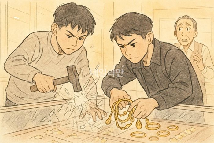 이들은 미리 준비한 망치로 유리 진열대를 부수고 그 안에 있던 귀금속을 훔쳐 달아났다.
