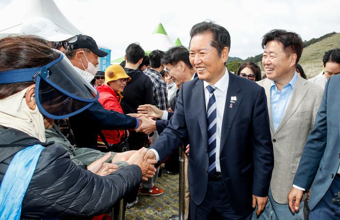 정청래 더불어민주당 대표가 25일 오후 제주시 애월읍 봉성리 새별오름에서 열린 '2025 제주도새기축제'를 찾아 도민과 관광객들과 인사를 나누고 있다. ⓒ뉴시스