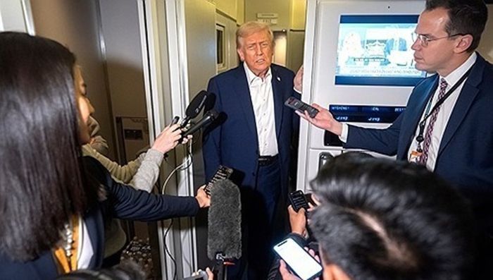 도널드 트럼프 미국 대통령이 24일(현지시간) 미 대통령 전용기인 에어포스원에서 취재진의 질문에 답하고 있다. ⓒ AP/연합뉴스