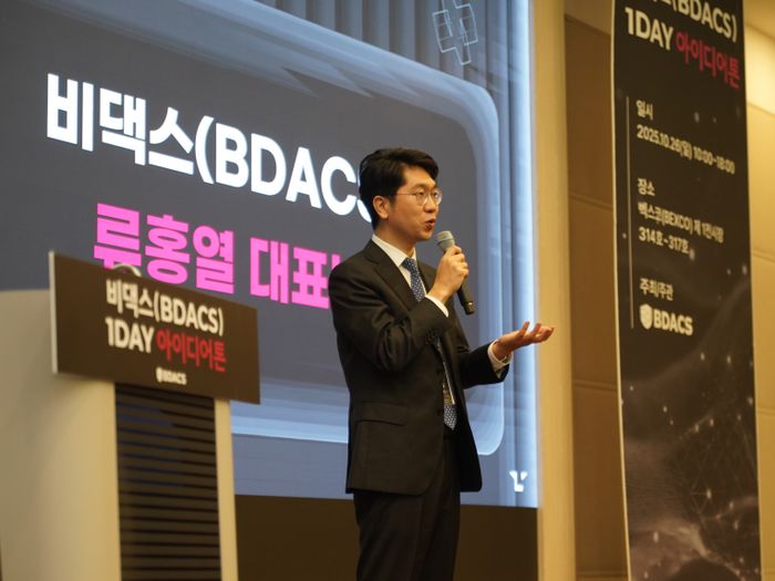 류홍열 비댁스 대표가 부산 백스코에서 열린 비댁스 1DAY 아이디어톤 행사에서 환영사를 전하고 있다. ⓒ비댁스