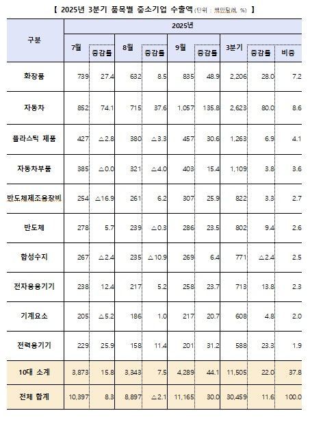 2025년 3분기 품목별 중소기업 수출액ⓒ중소벤처기업부 제공