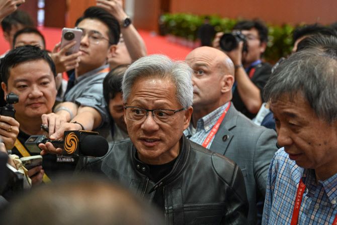 젠슨 황 엔비디아 최고경영자(CEO)가 17일(현지시간) 베이징에서 열린 중국 국제 공급망 박람회(CISCE)에서 ‘파이어사이드 채트’ 행사 후 언론과 대화하고 있다. ⓒAFP/연합뉴스