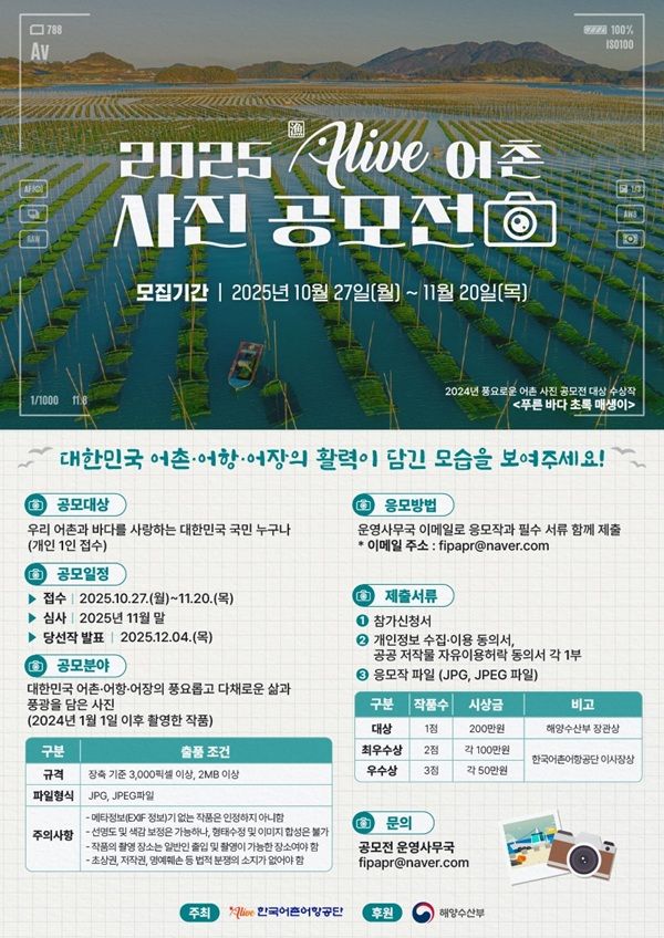 한국어촌어항공단(이사장 홍종욱, 이하 공단)은 ‘2025년 漁live 어촌 사진 공모전’ 응모작을 내달 20일까지 접수한다.
