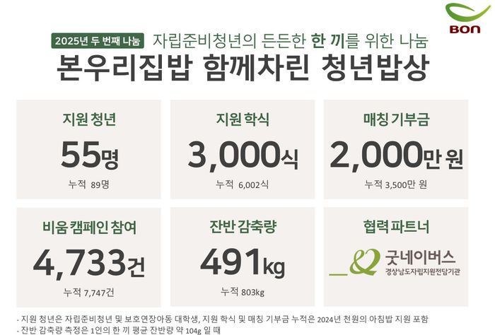 이는 본우리집밥은 지난 6월 전국 20개 사업장에서 진행한 ‘비움데이 나눔 캠페인’의 후속으로, 학업 외에도 주거나 생활비 등 필수적 지출로 재정 압박이 커지면 가장 먼저 식비를 줄일 수밖에 없는 고충과 이에 따른 학업 및 생활 환경 개선을 실질적으로 돕고자 추진됐다.
