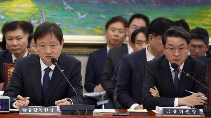 이찬진 금융감독원장이 27일 오전 서울 여의도 국회 정무위원회에서 열린 국정감사에서 의원 질의에 답변하고 있다. 오른쪽은 이억원 금융위원회 위원장. ⓒ뉴시스