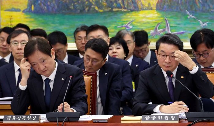 이억원 금융위원회 위원장과 이찬진(왼쪽) 금융감독원장이 27일 오전 서울 여의도 국회 정무위원회에서 열린 국정감사에서 의원 질의를 듣고 잠시 손으로 이마를 짚고 있다.ⓒ뉴시스