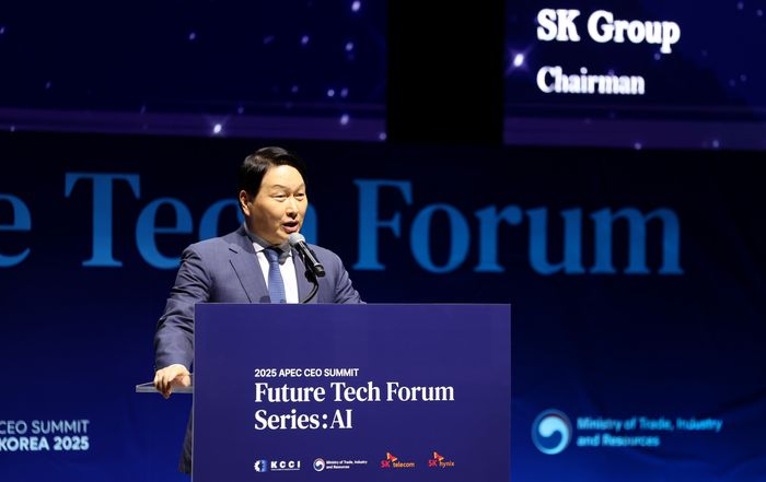 최태원 SK그룹 회장이 28일 경북 경주엑스포대공원 문화센터에서 열린 아시아태평양경제협력체(APEC) 최고경영자(CEO) 서밋 ‘퓨처테크 포럼: AI’에서 환영사를 하고 있다. ⓒ뉴시스