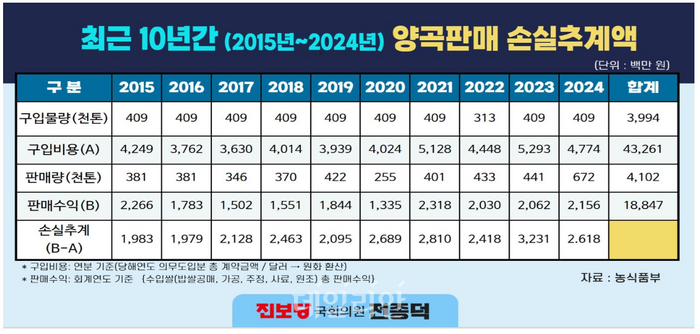 최근 10년간 양곡판매 손실 추계액 이미지. ⓒ전종덕 의원실
