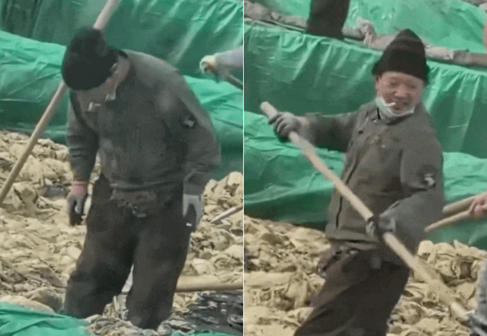 중국의 한 절임배추 작업장에서 작업자가 침을 뱉고 담배를 피우는 장면이 포착돼 충격을 주고 있다.