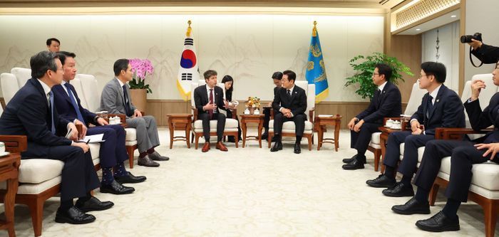 지난 1일 샘 알트만 오픈AI 대표가 서울 용산 대통령실 청사를 방문한 모습. 이재용 삼성전자 회장과 최태원 SK그룹 회장이 동석했다.ⓒ뉴시스