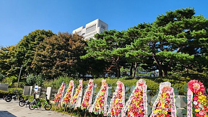 지난 28일 서울 서초구 대법원 청사 앞에 민주당 주도의 사법개혁에 반대하는 시민들의 화환이 놓여져 있는 모습. ⓒ데일리안 진현우 기자