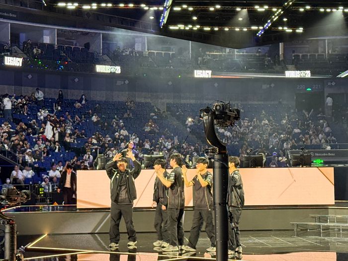 KT가 29일 중국 상하이 메르세데스-벤츠 아레나에서 열린 2025 롤드컵 8강에서 CFO를 상대로 승리한 후 관객을 향해 손을 흔들고 있다. ⓒ데일리안 황지현 기자