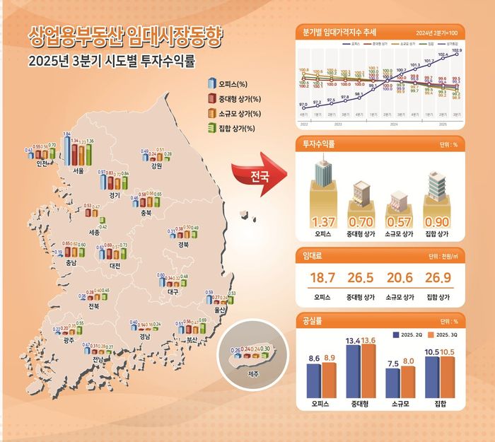 임대가격지수는 오피스는 전분기 대비 0.44% 상승한 반면, 상가는 중대형(-0.10%), 소규모(-0.24%), 집합(-0.12%) 등 모두 하락하며 평균 0.13% 떨어진 것으로 나타났다.