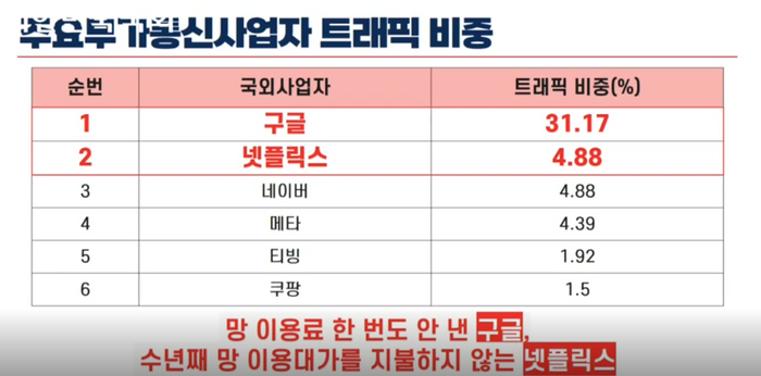 과학기술정보통신부에 따르면 작년 국내 하루 평균 트래픽 비중은 구글 30.55%, 넷플릭스 6.94%, 메타 5.06%로 이들 3사의 비중이 절반(42.55%)에 가깝다. 이들 CP는 막대한 트래픽을 만들어내는 주체인만큼 망 사용료를 지불해야 한다는 것이 ISP측 입장이다.