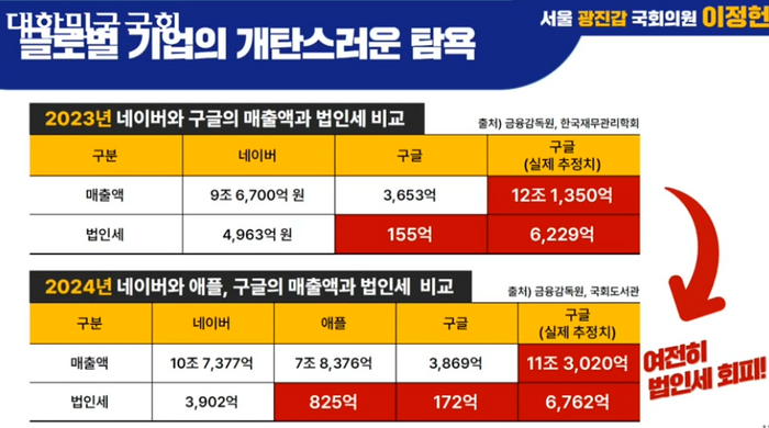 인앱결제 수수료처럼 구글이 막대한 수익은 올리면서도, 국내에 법인세는 제대로 납부하지 있다는 점도 도마 위에 올랐다.