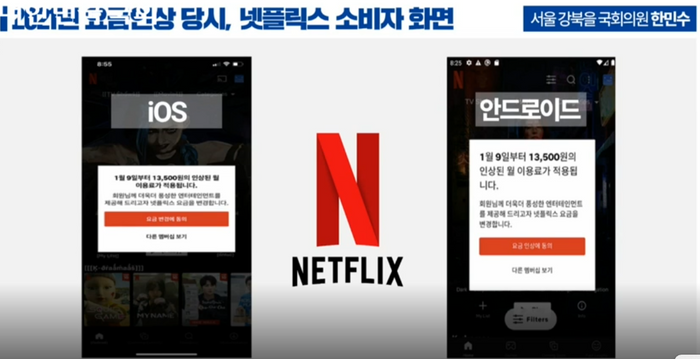 2021년 요금 인상 당시 넷플릭스 소비자 화면(자료 : 한민수 의원실). 의사중계시스템 캡처