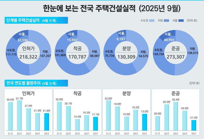 착공은 2만9936가구로 한 달 전보다 83.6% 늘었으나, 1~9월 누계 기준으로는 17만787가구로 집계되며 11.3% 감소했다.
