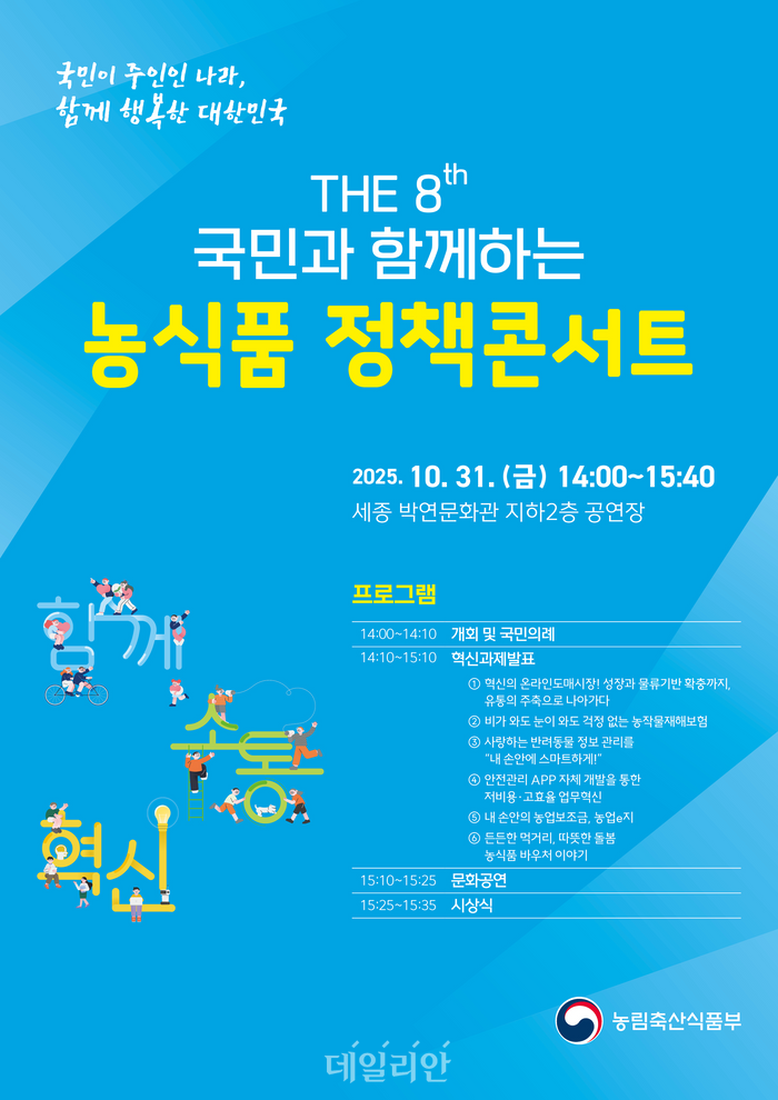2018년부터 매년 열려 올해로 8회째를 맞은 이번 콘서트는 한 해 동안 추진된 농식품 혁신정책 성과를 공유하고, 국민이 직접 우수사례를 선정하는 참여형 행사로 진행됐다. ‘모두의 농정 메신저’를 통해 모집된 현장 국민평가단과 ‘정부혁신 어벤져스’ 등 180여 명이 참석했다.