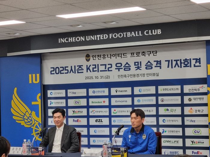 윤정환(사진 왼쪽) 인천유나이티드 감독과 주장 이명주 선수가 2025시즌 K리그2 우승 및 승격 기자회견이 열린 31일 오후 인천 중구 인천축구전용경기장에서 승격 소감을 이야기 하고 있다. ⓒ 데일리안 김평호 기자