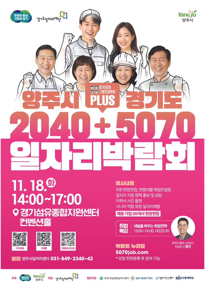 경기 양주시는 경기도 및 경기도일자리재단과 함께 오는 11월 18일 경기섬유종합지원센터 컨벤션홀에서 '양주시+경기도 2040+5070 일자리박람회'를 개최한다고 밝혔다.