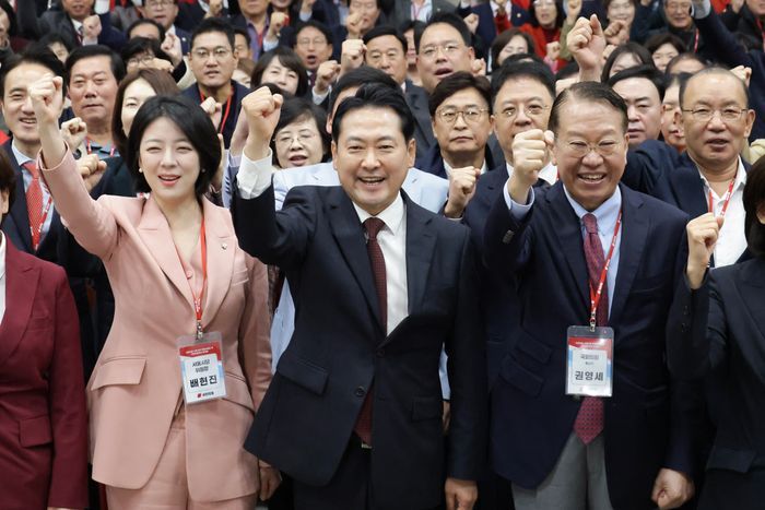 장동혁 국민의힘 대표가 31일 서울 강남구 세텍 컨벤션센터에서 열린 국민의힘 서울시당 당협위원장 및 선출직 공직자 워크숍에서 배현진 서울시당위원장 등 참석자들과 함께 구호를 외치고 있다. ⓒ국민의힘