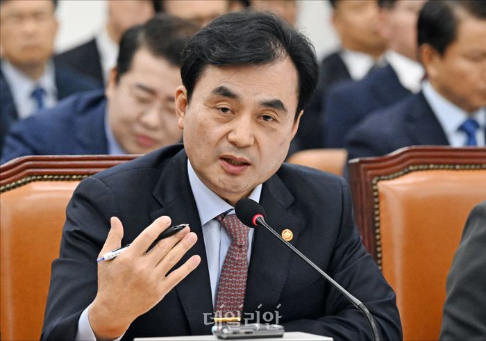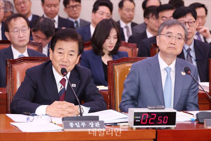 정동영 통일부 장관이 28일 서울 여의도 국회에서 열린 국회 외교통일위원회의 2025 종합 국정감사에서 질의에 답변하고 있다.