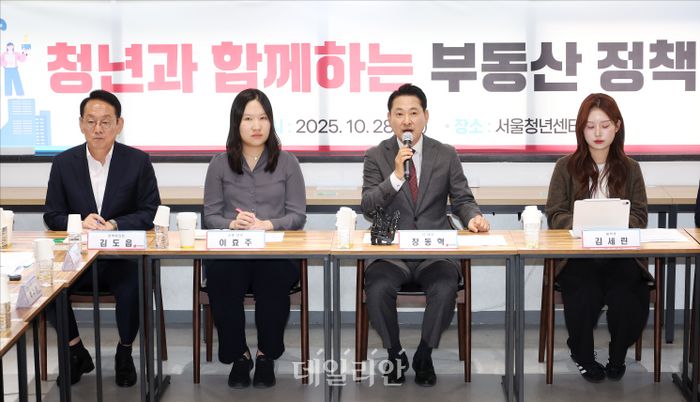 장동혁 국민의힘 대표가 28일 오후 서울 마포구 서울청년센터마포에서 열린 '집 걱정 없는 미래, 청년 생각에서 시작합니다' 청년과 함꼐하는 부동산 정책 간담회에서 인사말을 하고 있다.