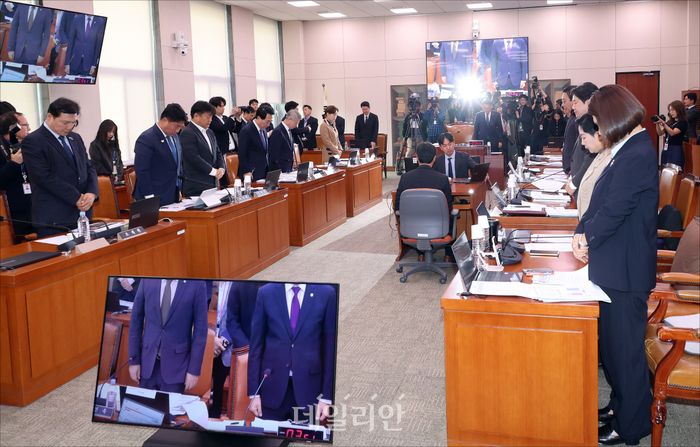 감사위원들과 피감기관 관계자들이 29일 서울 여의도 국회에서 열린 국회 문화체육관광위원회의 2025 종합 국정감사에서 10.29 이태원 참사 3주기를 맞아 오전 10시 29분에 묵념을 하고 있다.