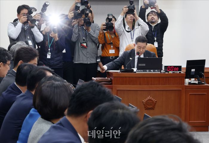 김병기 국회 운영위원회 위원장(더불어민주당 원내대표)이 29일 서울 여의도 국회에서 열린 국회 운영위원회 전체회의에서 대통령실 2025 국정감사 증인 채택의 건을 의결하고 있다.
