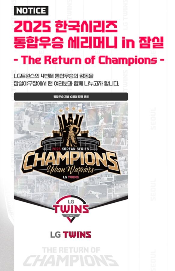 한편, 원정에서 일군 통합우승의 감동을 더 많은 홈팬들과 나누기 위해 LG는 1일 오후 6시30분부터 잠실야구장에서 ‘한국시리즈 통합우승 IN 잠실’ 행사를 개최한다.